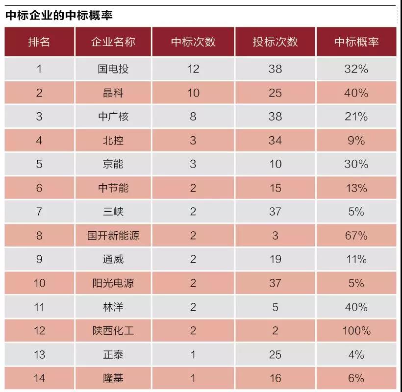 據(jù)統(tǒng)計(jì),此次領(lǐng)跑者投標(biāo)一共有52家企業(yè)參與,最終14家企業(yè)中標(biāo)。其中,國(guó)電投、中廣核、晶科三家企業(yè)最終包攬了71%的規(guī)模,共計(jì)容量2843MW。