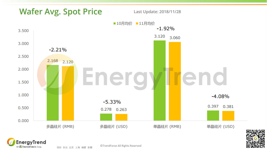 硅片環(huán)節(jié),多晶硅片的人民幣月均價為從10月的 RMB2.168/Pc 減少至11月的 RMB2.12/Pc,下跌幅度為 2.21%; 美金月均價為從10月的 US$0.278/Pc 減少至11月的 US$0.263/Pc,下滑幅度達到 5.33%。單晶硅片11月的人民幣月均價為 RMB3.06/Pc,比 10月的 RMB3.12/Pc 稍有下滑;其美金月從 10月的 US$0.397/Pc 掉至 US$0.381/Pc,下跌幅度為 4.08%。