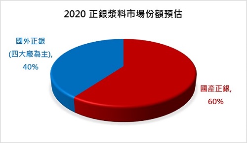 (1)國(guó)產(chǎn)正銀導(dǎo)電漿供應(yīng)商劇增:目前較知名的國(guó)產(chǎn)正銀供應(yīng)商,例如無(wú)錫帝科、蘇州晶銀、常州聚和、上??镉?、杭州正銀、深圳首騁、江蘇歐耐爾、浙江光達(dá)…等企業(yè),再加上正在投入開發(fā)的新興公司至少超過(guò)了20家以上,根據(jù)資料統(tǒng)計(jì)2016年國(guó)產(chǎn)正銀已達(dá)近20%的市場(chǎng)份額,預(yù)估在2017年國(guó)產(chǎn)正銀將會(huì)持續(xù)成長(zhǎng)到30%,且往后每年會(huì)維持穩(wěn)定增加,預(yù)估2020年將有機(jī)會(huì)達(dá)到整體正銀市場(chǎng)的50-60%。