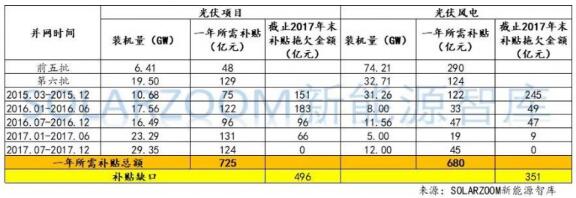 自2015年3月以后并網的光伏和風電等可再生能源項目還未被納入到國家可再生能源補貼目錄內,這一范圍內的可再生能源項目補貼皆被拖延,記者根據(jù)補貼被拖延項目的并網時間和裝機量來估算截至2017年末中國可再生能源補貼缺口。經測算,截止2017年末,光伏項目可再生能源補貼拖欠金額已高達496億元,風電項目可再生能源補貼缺口金額已高達351億元。