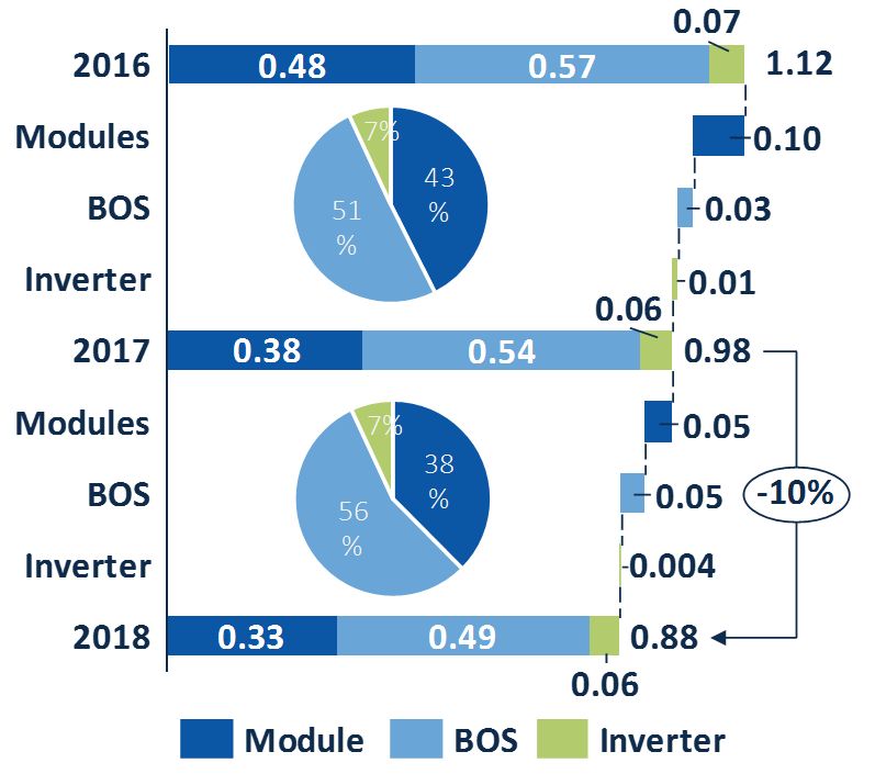 2018年,系統(tǒng)平衡成本將占公用事業(yè)規(guī)模光伏項目成本的最大份額。GTM Research太陽能分析師Rishab Shrestha指出,除了降低硬件成本之外,效率改進,高功率組件和1500伏系統(tǒng)將提供BOS成本節(jié)省,幫助太陽能與全球其他市場的發(fā)電源相競爭。