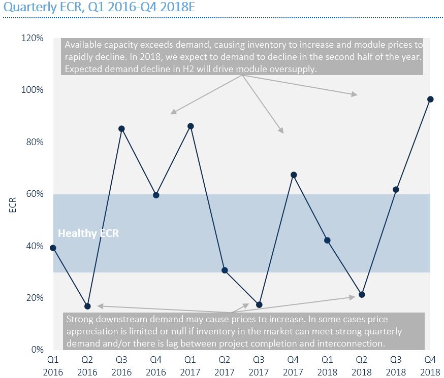 產(chǎn)能過剩比率是可用能力與需求之間的比率。GTM Research將健康太陽能模塊ECR范圍定義為30%到60%之間。當ECR在這個范圍內(nèi)時,模塊價格更可能以穩(wěn)定的價格下降。當ECR超過這個范圍時,市場供過于求,價格預(yù)計會以更快的速度下降。