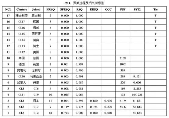 表4中,NCL為當(dāng)前系統(tǒng)存在類的總個數(shù),Clusters為當(dāng)前加入的編號,Joined表示加入該類的國家,F(xiàn)REQ表示新類的元素個數(shù),SPRSQ表示類與類之間規(guī)格化最短距離,RSQ表示R2統(tǒng)計量,ERSQ表示偏R2統(tǒng)計量,CCC為統(tǒng)計量值,PSF為偽F統(tǒng)計量,PST2為偽T2統(tǒng)計量,Tie表示“節(jié)”。從CCC統(tǒng)計量可以看出,聚為3類時的值最大;若聚為4類,偽F統(tǒng)計量PSF和偽T2統(tǒng)計量都變化較大。綜合各方面的情況,聚為3類最為合適。