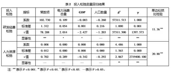 電力消費(fèi)總量對研發(fā)經(jīng)費(fèi)投入的松弛變量具有正向影響,說明電力消費(fèi)總量較大但也并不能有效增加行業(yè)內(nèi)創(chuàng)新資源的配置。原因在于,盡管行業(yè)的消費(fèi)需求量很大,帶動了政府對行業(yè)創(chuàng)新給予較多的資金支持,但是獲得資金支持的企業(yè)可能對研究經(jīng)費(fèi)的管理較為粗放,造成浪費(fèi)。國內(nèi)生產(chǎn)總值和人口數(shù)量對研究經(jīng)費(fèi)松弛變量的影響為負(fù),說明經(jīng)濟(jì)實(shí)力的強(qiáng)度可以有效增進(jìn)光伏行業(yè)創(chuàng)新資源的配置。電力消費(fèi)總量、人口和GDP對于人力資源投入的松弛變量的影響并不顯著。