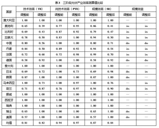 對18個國家光伏產(chǎn)業(yè)效率的投入變量進(jìn)行調(diào)整后,再根據(jù)調(diào)整后的投入變量和原始產(chǎn)出變量,計算剔除了外部環(huán)境因素和隨機(jī)誤差的技術(shù)效率,如表3所示。與調(diào)整前相比,調(diào)整后的政策效率發(fā)生了變化。從18個國家光伏產(chǎn)業(yè)的平均效率值來看,技術(shù)效率從0.81上升到0.82,純技術(shù)效率從0.94上升到0.97,規(guī)模效率從0.87下降到0.84,波動的幅度較小??偟膩碚f,樣本國家的純技術(shù)效率在第一階段被低估,規(guī)模效率在第一階段被高估。