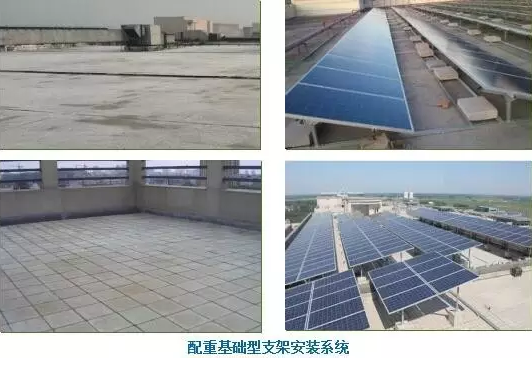 這個(gè)方案是這是第三類,剛才的是屬于澆筑混凝土形式。在現(xiàn)有的建筑立,這是非常容易見(jiàn)到的。常規(guī)屋頂?shù)纳厦嬗蟹浪灿斜Wo(hù)層,但開(kāi)始建造的時(shí)候沒(méi)有考慮安裝光伏系統(tǒng)。第一種是外表面是混凝土的保護(hù)層,下面是貼的是屋頂?shù)拇纱u。這兩種安裝方式是配重基礎(chǔ)加支架,這種安裝方式要找其他地方重新計(jì)算載荷,實(shí)現(xiàn)起來(lái)也比較簡(jiǎn)單。