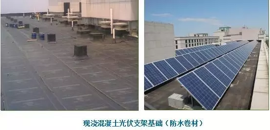 上圖防水卷材已經(jīng)外露了,但防水卷材上面已經(jīng)用了光伏支架的安裝基礎(chǔ)。它和第一個(gè)的區(qū)別,剛才那個(gè)方案防水卷才已經(jīng)被混凝土保護(hù)了,使用年限很長(zhǎng),防水效果也很理想。這個(gè)方案是卷材外露了,有可能以后出現(xiàn)防水破壞或者是防水壽命滿足不了的時(shí)候,可以把防水層換掉。因?yàn)橐呀?jīng)預(yù)留了基礎(chǔ),和屋頂是一體的防水,不涉及到光伏板的拆除,直接各放各的就行了。