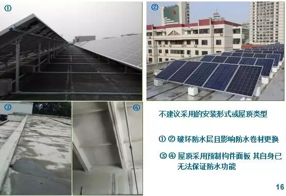 上圖是在防水卷材上直接安裝配種塊的安裝方式,如果以后防水層破壞了,需要重新更換防水層的時(shí)候,光伏支架系統(tǒng)同樣會(huì)受到牽連。第二張圖和第一張圖很類似,只是安裝方式不太一樣,也是直接放到防水卷材上。第三和第四張圖表面上看上去是由混凝土保護(hù)好了,但室內(nèi)看已經(jīng)漏水很嚴(yán)重了。