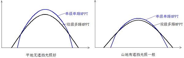 在山地或者屋頂有遮擋光照條件一般的地區(qū),雙級多路MPPT的逆變器發(fā)電量高。這是因為在低電功率發(fā)電時間段時間較長,高功率發(fā)電時間較短。