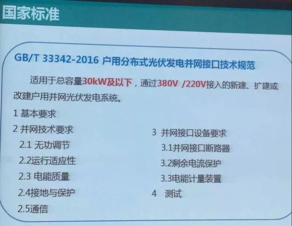 另外,該領(lǐng)導(dǎo)介紹,在新起草完成,即將頒布的新國標(biāo)《戶用分布式光伏發(fā)電并網(wǎng)接口技術(shù)規(guī)范》(GB/T33342-2016)中,也刪除了“不高于接入變壓器容量25%”的規(guī)定。