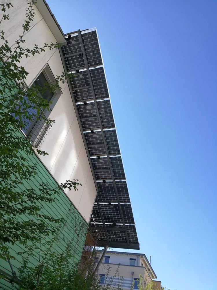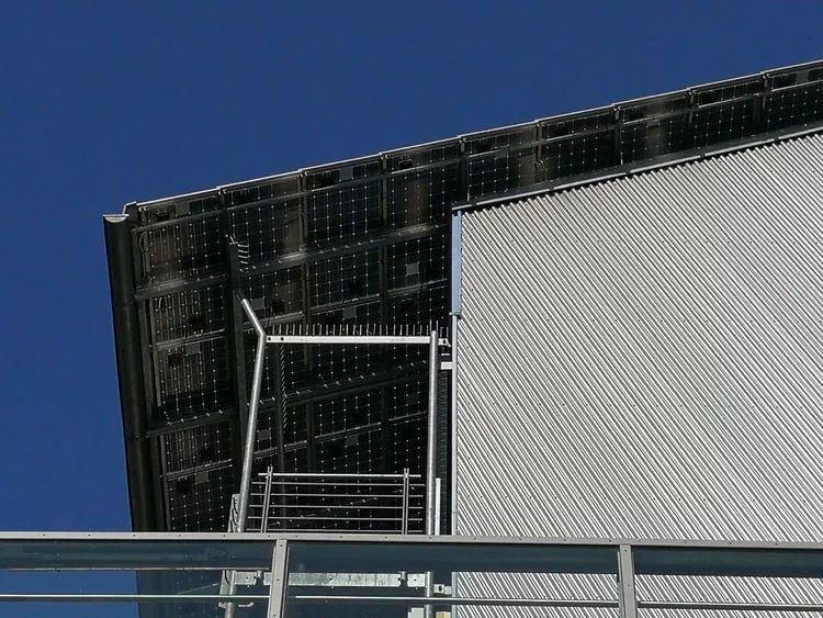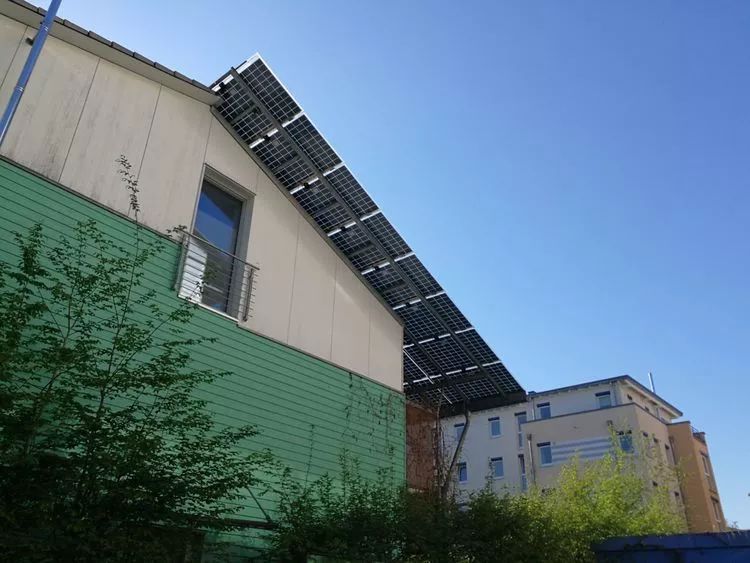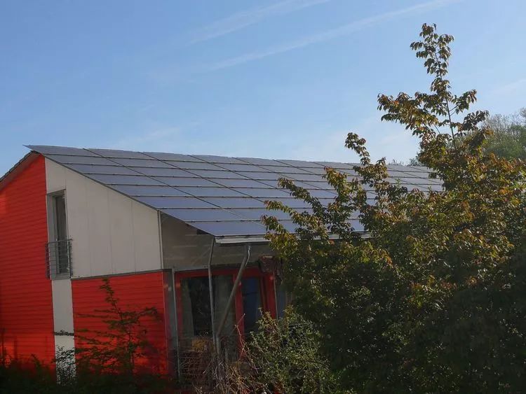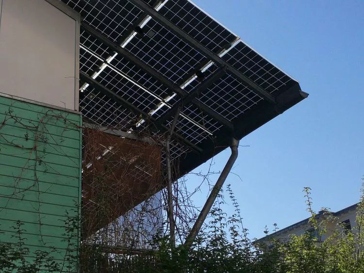 光伏板不僅在南側(cè)伸出很長,還在西側(cè)也伸出不少,這樣可以增加安裝面積。這樣的一個房子的光伏屋頂發(fā)的電,明顯要多于這幢建筑自用的電量。
