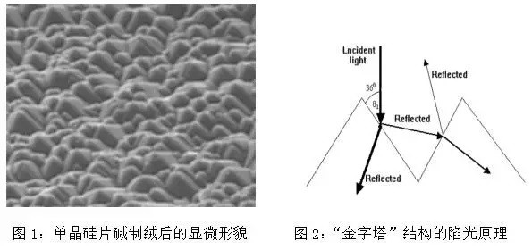 從本質(zhì)上講,絨面形成過程是:NaOH溶液對不同晶面的腐蝕速率不同,(100)面的腐蝕速度比(111)面大十倍以上,所以(100)晶向的單晶硅片經(jīng)各向異性腐蝕后,最終在表面形成許許多多表面為(111)的四面方錐體,即“金字塔”結(jié)構(gòu)(如圖1)。此結(jié)構(gòu)形成后,當光入射到一定角度的金字塔斜面,光會反射到另一角度的斜面,形成二次或更多次吸收,從而減少硅片表面的反射率,即陷光效應(如圖2)。“金字塔”結(jié)構(gòu)的大小與均勻性越好,陷光效應越明顯,硅片表面發(fā)射率越低。