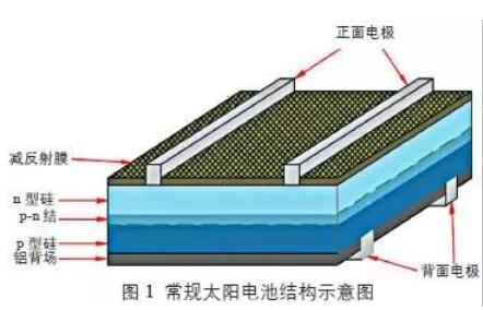 圖1為常規(guī)太陽能電池結(jié)構(gòu)示意圖,常規(guī)太陽能電池的制備工藝簡單、成本較低,但和其他硅基太陽能電池技術(shù)相比,其轉(zhuǎn)換效率較低。