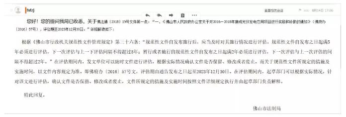 評估期?什么是評估期啊?佛山補(bǔ)貼真的延長了嗎?作為一個(gè)負(fù)責(zé)任的光伏人,小編決定致信佛山法制局,尋求官方解析!