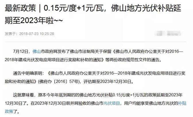 之前,在網(wǎng)上傳出佛山0.15元/千瓦時(shí)+1元/瓦的光伏補(bǔ)貼政策要延期至2023年的消息!