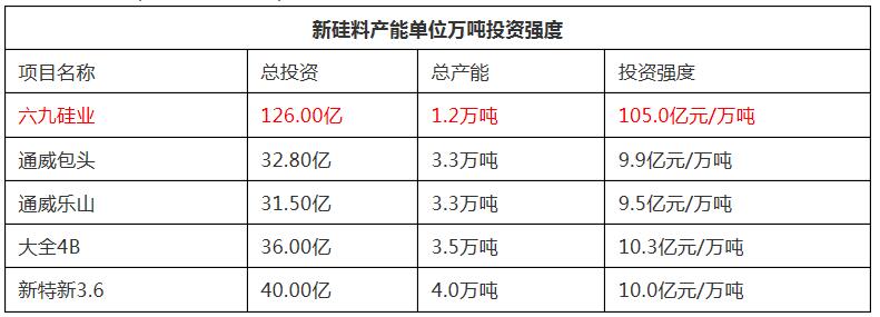 六九硅業(yè)是拖垮英利太陽能的重要敗筆,在行業(yè)狂熱頂峰期英利大手筆負(fù)債布局硅料業(yè)務(wù),在2010年的可行性報(bào)告中,總產(chǎn)能區(qū)區(qū)1.2萬噸的六九硅業(yè)廠的總的資本支出高達(dá)126億元。彼時(shí)大家硅料生產(chǎn)成本多在30美金/kg的水準(zhǔn),而硅料售價(jià)卻高達(dá)100~150美金。