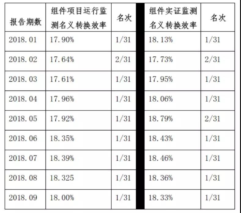 上表為2018年前三季度大同一期領(lǐng)跑者基地監(jiān)測月報中,英利熊貓雙玻組件的轉(zhuǎn)換效率數(shù)據(jù)及排名情況,其中組件實證監(jiān)測名義轉(zhuǎn)換效率為實證監(jiān)測平臺清洗后的組件名義轉(zhuǎn)換效率測算結(jié)果。