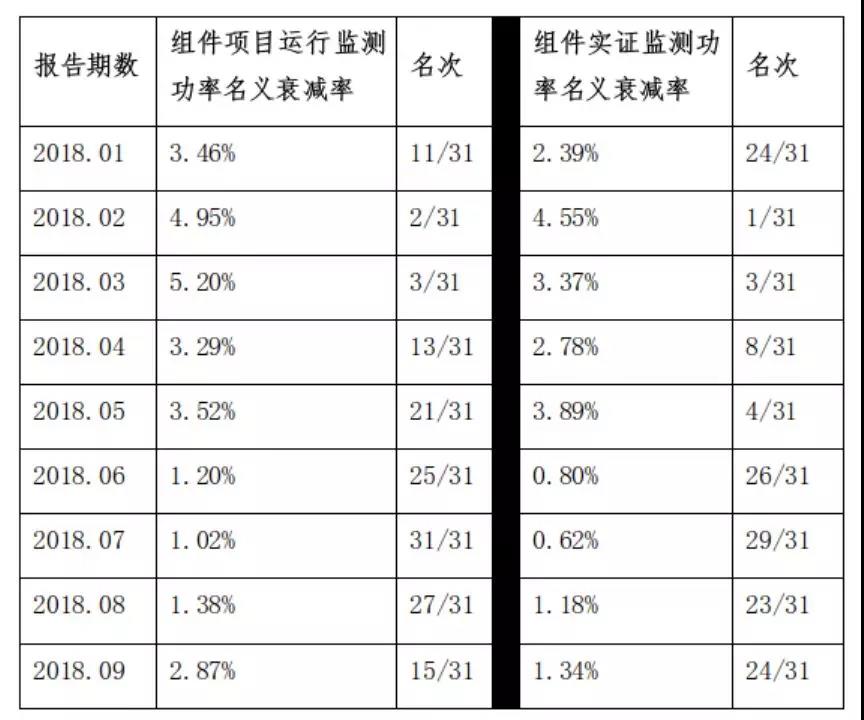 上表是2018年前三季度大同一期領(lǐng)跑者基地監(jiān)測月報中,英利熊貓雙玻組件的衰減率數(shù)據(jù)及排名情況,其中組件實證監(jiān)測功率名義衰減率為實證監(jiān)測平臺清洗后的組件名義衰減率測算結(jié)果。需注意的是,上圖中名次位數(shù)越高,代表組件衰減率越低。