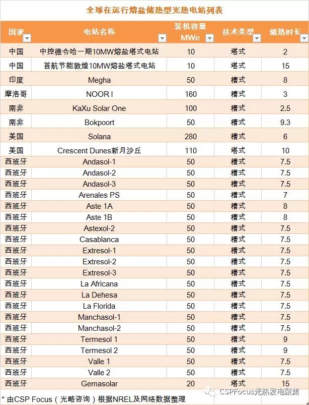 全球在運(yùn)行儲熱型光熱電站統(tǒng)計(jì)