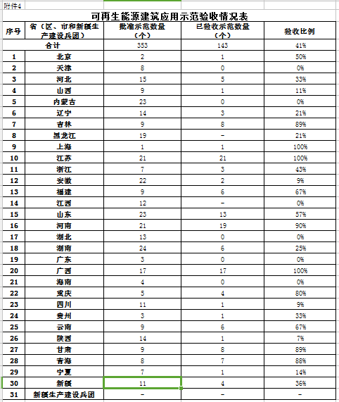 關(guān)于可再生能源建筑應(yīng)用相關(guān)示范驗收。截至2016年底,全國各?。▍^(qū)、市和新疆生產(chǎn)建設(shè)兵團)已累計完成可再生能源建筑應(yīng)用各類示范143個,占批準示范數(shù)量的41%。上海、江蘇、廣西已完成全部各類示范的驗收工作,吉林、河南、重慶、甘肅、青海已驗收數(shù)量超過批準示范數(shù)量的80%以上,江西、內(nèi)蒙古、湖北、廣東、海南、天津等地示范項目驗收進度滯后。
