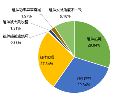 如上圖所示,光伏組件存在熱斑、組件遮擋和組件破損等缺陷,其次是組件安裝角度不一致,再者是組件功率異常衰減、組件被大風(fēng)吹翻和組件接線盒燒毀等問(wèn)題。