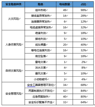 從50座典型電站的安全隱患統(tǒng)計(jì)表中可以看出,大多數(shù)光伏電站均存在不同程度的安全隱患,嚴(yán)重影響電站人員和設(shè)備的安全。其中組件熱斑問(wèn)題比較嚴(yán)重,50座電站中有49座電站均出現(xiàn)不同程度的組件熱斑現(xiàn)象;安全管理風(fēng)險(xiǎn)這塊則是整個(gè)安全隱患中的重災(zāi)區(qū)。