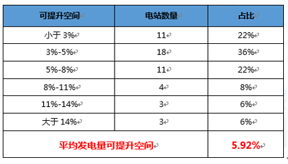 從50座典型電站的發(fā)電量提升空間分析表中可以看出:50座電站中只有11個(gè)電站發(fā)電量提升空間小于3%,有6個(gè)電站發(fā)電量提升空間大于11%,有29座電站也就是多一半的電站發(fā)電量提升空間在3%~8%之間,50座電站的平均發(fā)電量提升空間為5.92%,可見(jiàn)發(fā)電量提升空間非常的巨大。