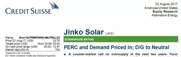2017年8月22日,CreditSuisse(以下簡(jiǎn)稱CS)也降低了晶科能源的評(píng)級(jí)。