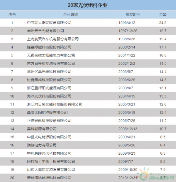由表可知,20家組件企業(yè)中, 5家企業(yè)的歷史在15年以上,14家企業(yè)的歷史在10年以上。