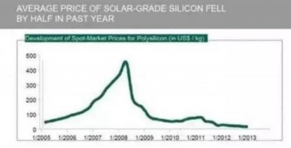 2005年-2013年全球太陽能級多晶硅價(jià)格走勢圖