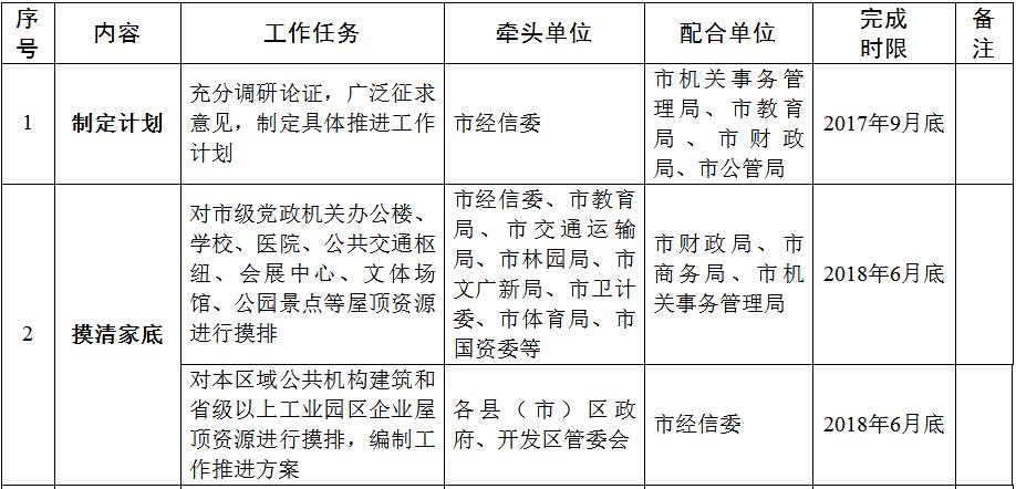 (二)試點(diǎn)示范階段(2017年10月-2018年6月)。組織開展公共機(jī)構(gòu)建筑和園區(qū)企業(yè)屋頂資源摸排。推進(jìn)市級(jí)黨政機(jī)關(guān)辦公樓和學(xué)校等公共機(jī)構(gòu)建筑光伏應(yīng)用試點(diǎn)項(xiàng)目建設(shè),認(rèn)真總結(jié)試點(diǎn)經(jīng)驗(yàn)。