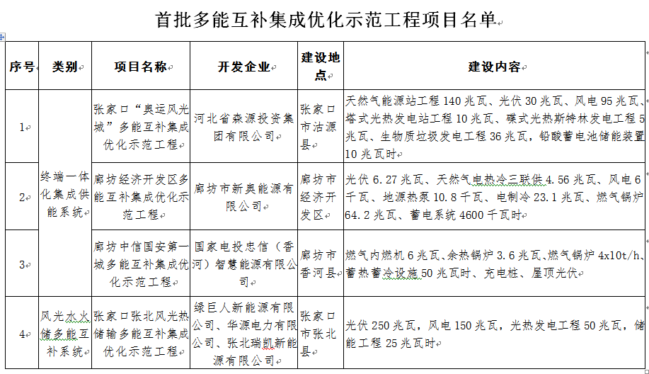 張家口、廊坊市發(fā)展改革委,國網(wǎng)冀北電力有限公司:按照國家能源局《關(guān)于公布首批多能互補集成優(yōu)化示范工程的通知》(國能規(guī)劃〔2017〕37號)和《關(guān)于河北省多能互補集成優(yōu)化示范工程建設(shè)有關(guān)事項的復(fù)函》(國能