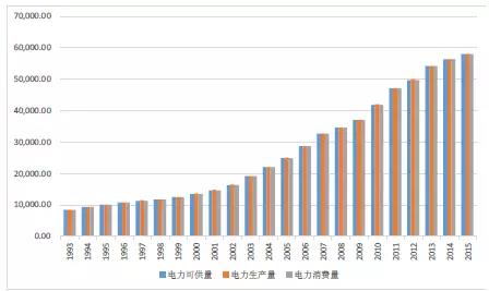 1993-2015年中國(guó)電力情況(單位:億kWh)