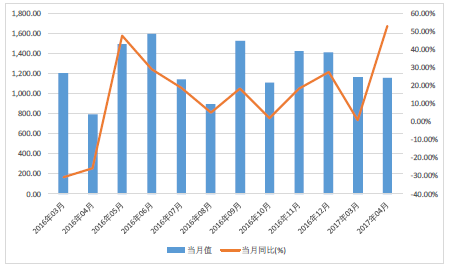 2016年3月-2017年4月中國(guó)發(fā)電設(shè)備產(chǎn)量(單位:萬(wàn)kWh)