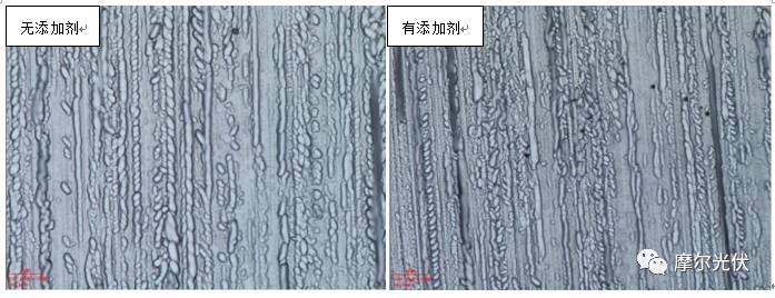 那么,怎么通過調(diào)試獲得最佳的工藝配比呢?通過金剛線添加劑實(shí)驗(yàn)發(fā)現(xiàn):在適當(dāng)?shù)某跖浔壤?,可通過逐步的工藝調(diào)整得到理想藥液配比(包括添加劑量,HF、HNO3及DI用量,甚至帶速、溫度等、循環(huán)流量等)。工藝調(diào)試過程中遵循單一變量的原則,并重點(diǎn)監(jiān)控絨面、反射率(表面敏感程度)、減重及外觀黑絲狀況等參數(shù),通過每次工藝調(diào)整后各監(jiān)控參數(shù)的變化分析藥液中各化學(xué)品量狀態(tài)(過量還是少量),尤其注意一些突變性的變化,這有助于快速幫助我們把握某些化學(xué)品的量是否適宜。配合對(duì)金剛線添加劑原理的理解及各種化學(xué)品的作用,可建立一個(gè)金剛線多晶硅片制絨反應(yīng)的模型,通過對(duì)工藝調(diào)試過程中各監(jiān)控參數(shù)變化進(jìn)行邏輯推理,可得到理想的金剛線添加劑藥液配比。針對(duì)不同用量的金剛線添加劑,可調(diào)試出不同的相適宜的HF/HNO3/DI配比,同時(shí)此方法亦可調(diào)試出最佳的HF/HNO3自動(dòng)補(bǔ)加比例。