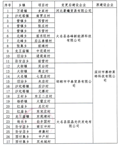 同意大名縣2016年村級(jí)光伏扶貧電站項(xiàng)目建設(shè)單位由原深圳市賽特萊特科技有限公司變更為河北署曦貿(mào)易有限公司、大名縣洛峰新能源科技有限公司、邯鄲市平泰貿(mào)易有限公司、大名縣燚晶光伏發(fā)電有限公司(詳見(jiàn)附件),并承擔(dān)后續(xù)扶貧工作,其他內(nèi)容不變。