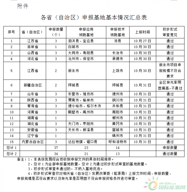 近日國家能源局公布2017年光伏發(fā)電領(lǐng)跑基地申報(bào)基本情況:截至10月31日,共有15個(gè)?。ㄗ灾螀^(qū))正式提交37份申報(bào)材料,包含23家應(yīng)用領(lǐng)跑基地和14家技術(shù)領(lǐng)跑基地。最終有34家光伏發(fā)電領(lǐng)跑者基地通過審查。新疆自治區(qū)拜城縣因全區(qū)棄光率明顯偏高,未通過審核;江西省新余市項(xiàng)目規(guī)模不達(dá)標(biāo),未能通過審核。