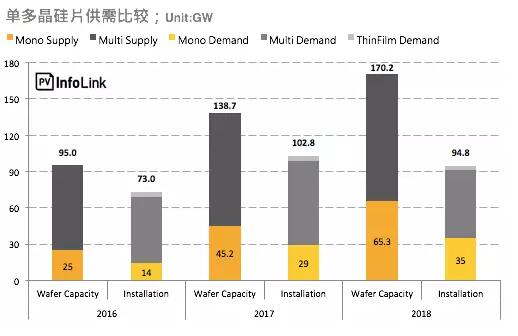 觀察單晶硅片產(chǎn)能在2016年底僅25GW,而2017Q1-Q2單晶硅片產(chǎn)能并未開始明顯成長之時,需求卻快速攀升,讓單晶硅片在今年上旬一直面臨供不應求的態(tài)勢。隨今年下半單晶硅片龍頭廠隆基、中環(huán)大舉擴充產(chǎn)能,年底單晶硅片產(chǎn)能已達45.2GW,應付明年度需求已綽綽有余,且明年產(chǎn)能仍持續(xù)拓展,使得2018年單晶硅片再也不會是光伏供應鏈內(nèi)的瓶頸環(huán)節(jié),價格的下探可期。