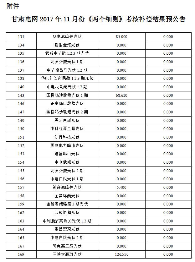 附件:甘肅電網(wǎng)2017年11月份“兩個細則”考核補償結果預公告(光伏)