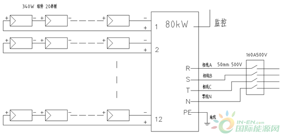 方案1,系統(tǒng)采用72片340Wp光伏組,20串12并共240塊組成,總功率 81.6KWp。采用1臺80KW光伏逆變器,接入380V線,送入光伏并網(wǎng)接入配電箱,再接入10kV柱上變壓器380V母線端。