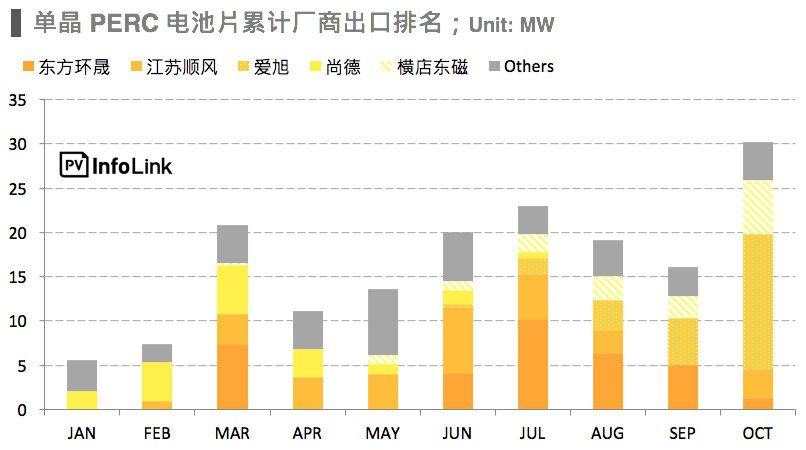 觀察全年PERC電池片的出口,在上半年順風與東方環(huán)晟的出口量互有千秋,但在今年年中開始,愛旭加入戰(zhàn)局,每個月的PERC電池出口持續(xù)攀升,并在今年九月、十月,都位居中國PERC電池片第一的寶座。預期待十一月數(shù)據出爐,愛旭今年累積PERC電池片出口量將超過順風,正式坐上出口PERC電池片的龍頭寶座。另外,橫店東磁的高效電池片出口量在十月也有顯著成長。
