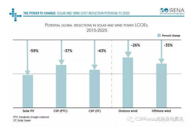 根據(jù)國際可再生能源署(IRENA)發(fā)布的報告預測,光伏、光熱、陸上和海上風電成本將大幅度下降,到2025年的十年期間,度電成本將分別下降26%-59%不等。作為目前較為主流的兩種光熱發(fā)電技術,槽式光熱發(fā)電成本將下