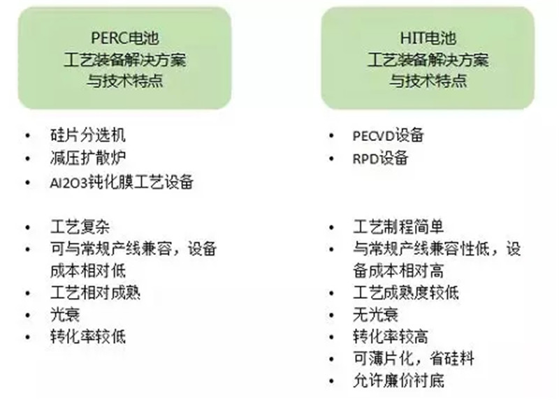 目前,國內(nèi)晶硅企業(yè)大量完成PERC技術(shù)導(dǎo)入。后期,相關(guān)企業(yè)將很有可能將PERC導(dǎo)入HIT。下圖展示了從工藝、設(shè)備與技術(shù)特性三個(gè)角度來講,PERC電池與HIT電池的差異。從下圖中可看出,PERC電池在工藝的復(fù)雜程度、產(chǎn)線的兼容性以及現(xiàn)階段工藝成熟度上勝于HIT電池,但固有的光衰問題與轉(zhuǎn)化率問題限制了它的發(fā)展,而HIT電池因其無光衰、高效的特性,在未來更具開發(fā)性。