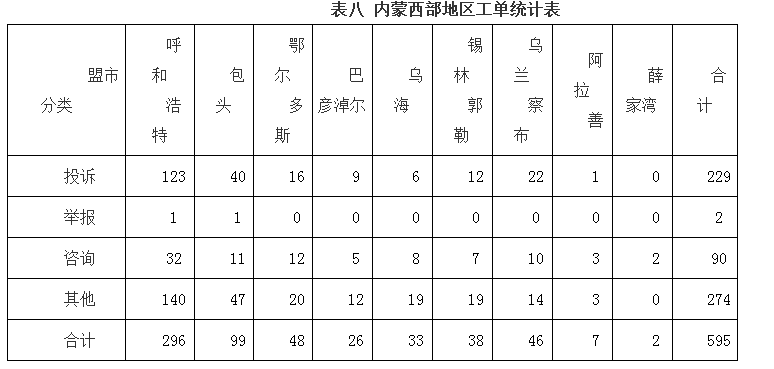 2017年,內(nèi)蒙西部地區(qū)工單共595件,其中投訴229件,舉報2件,咨詢90件,其他274件。(內(nèi)蒙西部地區(qū)工單統(tǒng)計表見表八)