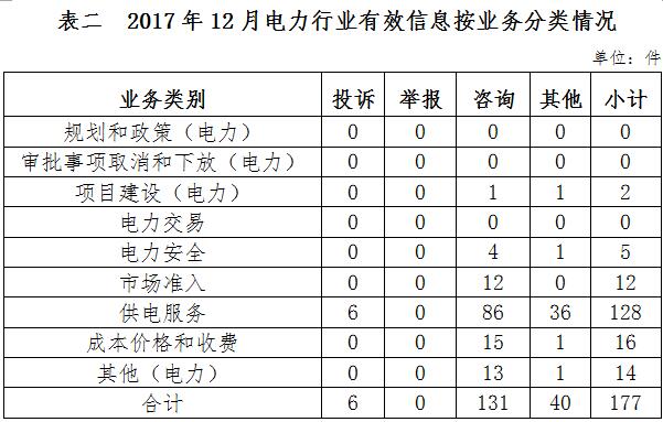 投訴共6件,集中在電力行業(yè)。從業(yè)務分類情況看,6件投訴均為供電服務。2017年12月電力行業(yè)有效信息按業(yè)務分類情況見表二。