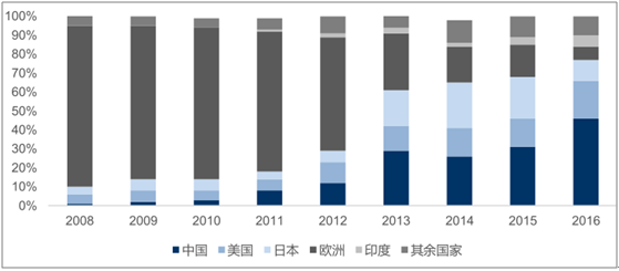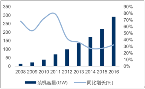 全球光伏市場規(guī)模持續(xù)增長,中國已成第一大市場。2016年全球光伏新增裝機71.2GW,同比增長51.24%;累計裝機約300GW,同比增長32%。中國是全球第一市場,2016年新增裝機容量34.2GW,占比46%。2017年前三季度,中國新增光伏裝機約43GW,同比增長65.4%;累計裝機量約120GW,同比增長72.6%。