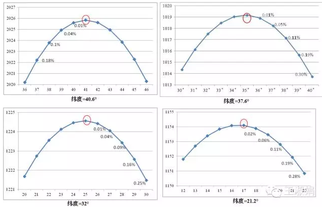 圖7:不同地點(diǎn),最佳傾角附近降低5度,傾斜面上的輻射量與最大值時(shí)的差值