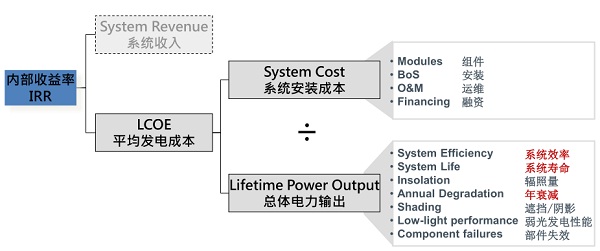 鑒于每瓦成本的局限性,業(yè)內專家開始倡導以度電成本(LCOE)來衡量光伏系統的性能和收益。度電成本(LCOE)提供了更準確的成本和現金流計算方式,能反映出真實的系統效能,并準確評估光伏電站的投資回報,能夠幫助電站投資者更加明智的測算系統性價比和收益。