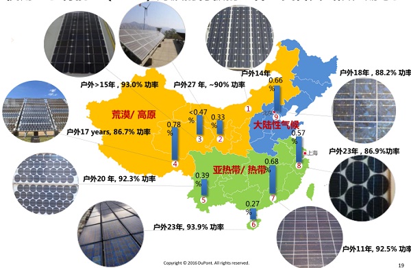 在2011年,杜邦啟動一項全球性的光伏組件研究,涵蓋了不同地區(qū)及氣候范圍。研究重點為光伏電站組件的可靠性與其它影響組件完整性的因素。至2015年底,杜邦戶外組件檢測研究已經在北美、歐洲和亞洲檢驗了超過60個光伏項目,包括了安裝時間0-30年的光伏項目,涵蓋了超過45家組件制造商的產品。以下是該項研究的一些結果分析。