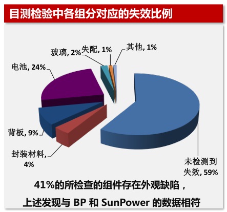 從檢測結果來看,未檢測到外觀失效的組件比例占到了59%,也就意味著還有41%的組件是存在一定外觀失效問題的。這其中電池所占的比率是24%,其次是背板,占到了9%。光伏組件中,電池和背板是最重要的兩個影響因素。